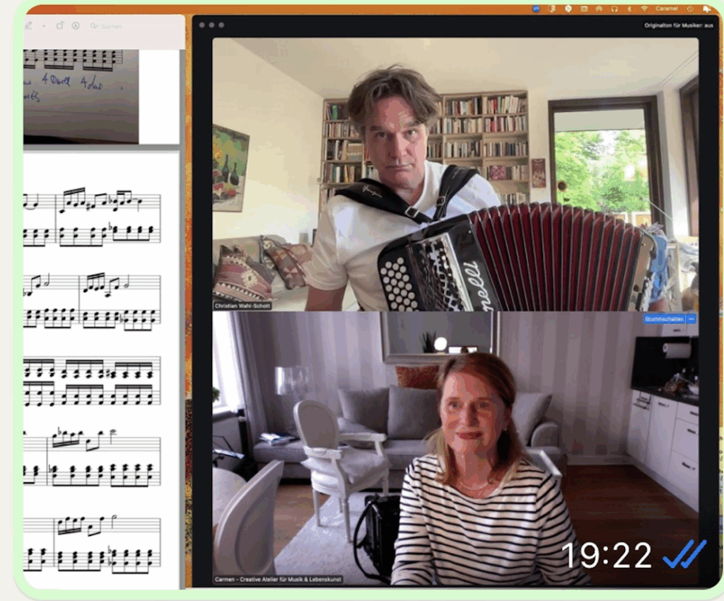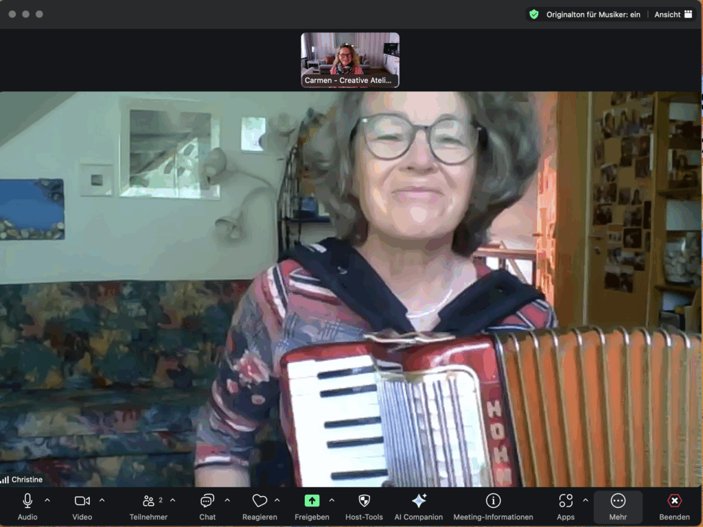 Fotos & Schnappschüsse Paul aus Berlin – Online Zoom Lesson 2025 Christian aus München – Zoom Lesson 2025 Christine aus Stuttgart – Online Zoom 2025 Creative Atelier Fest Skype Online Lessons Hans Akkordeon & Zazen „einfach nur sitzen!“ X-Mas Joy with D. Fotos aus Kursen & Lessons Winter Konzert Brunch 2015 Sommer Konzert Brunch 2015 Advent Konzert Brunch 2014 Sommer Konzert Brunch 2013 Sommer Konzert Brunch 2012